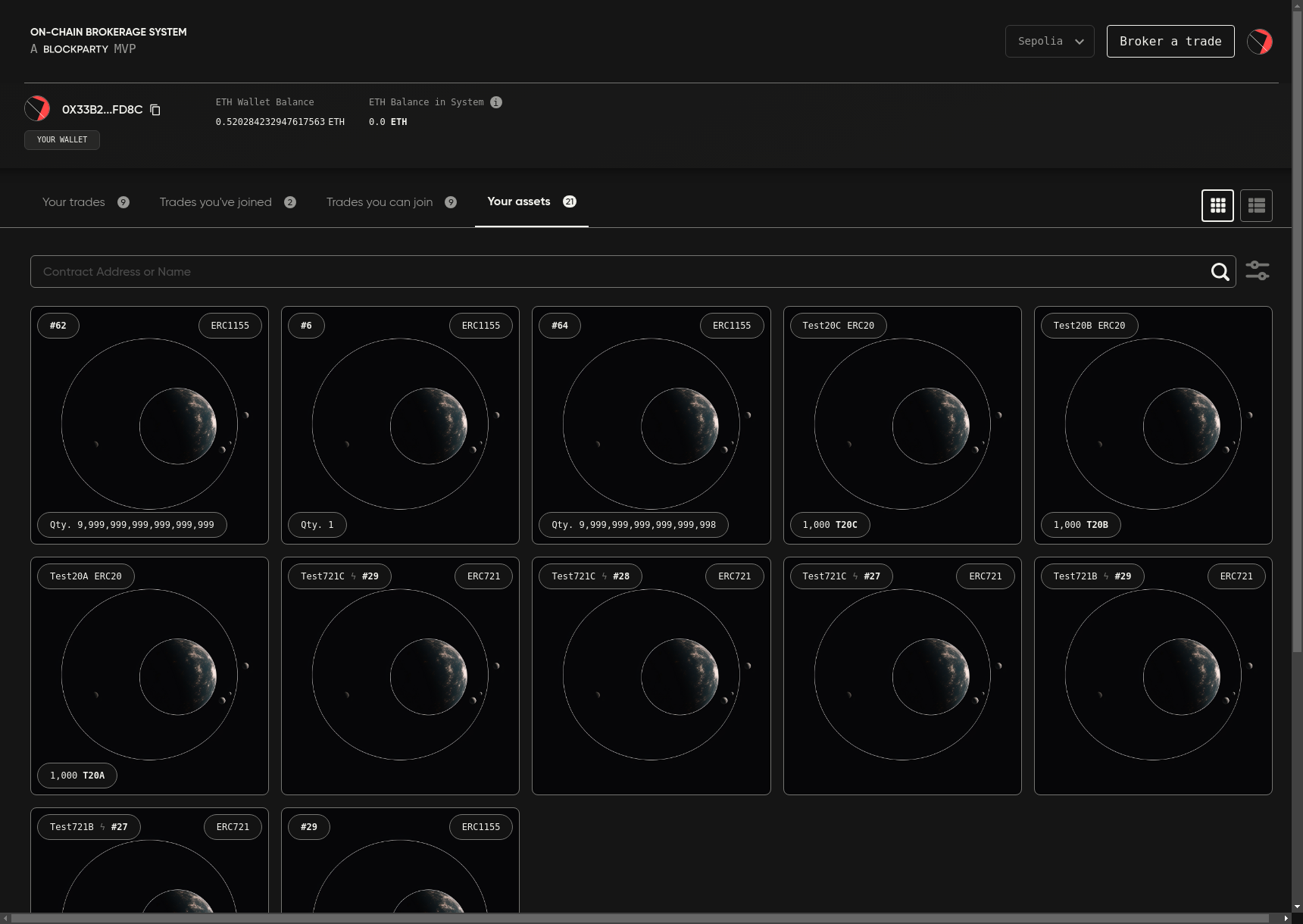 Your Profile page lets you view your assets, the trades you have brokered, the trades you have joined, and the trades you are eligible to join. Access your Profile via the round icon in the top right corner of the application.