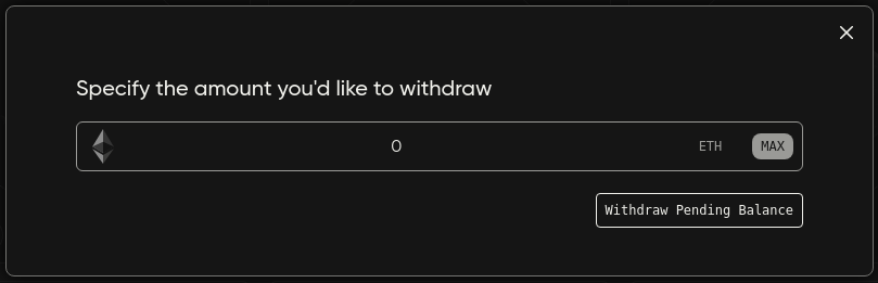 In the withdrawal modal, specify how much of your OBS balance you would like to withdraw. To withdraw your entire OBS balance, click MAX and then Withdraw Pending Balance. A wallet transaction prompt will appear and, once the transaction is signed and confirmed, the ETH amount will have been transferred to your connected wallet.