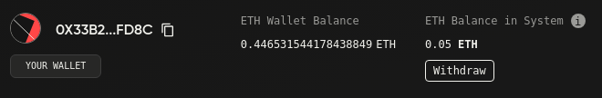 ETH Balance in System refers to the amount of ETH the connected wallet holds on OBS. Because OBS is 100% on-chain, any ETH a wallet receives upon trade execution or upon trade cancelation needs to be manually withdrawn from the OBS contract. Any ETH value owed to the connected wallet and held by OBS is reflected in this balance and can be withdrawn at any time by clicking Withdraw.